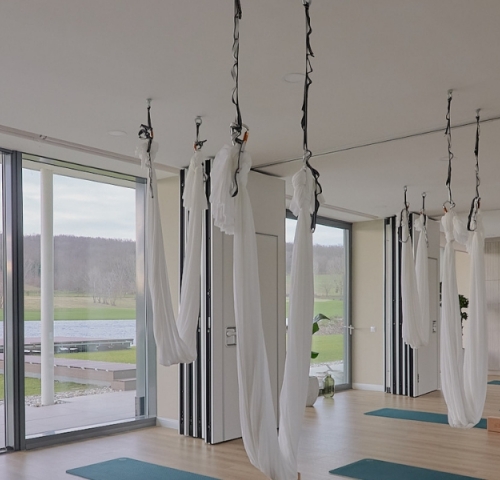 Für Aerial Yoga bequeme, eng anliegende, reißverschlussfreie Kleidung. Bitte mit kurz- oder langärmeligem Shirt erscheinen – ärmellose Tops sind nicht empfohlen!